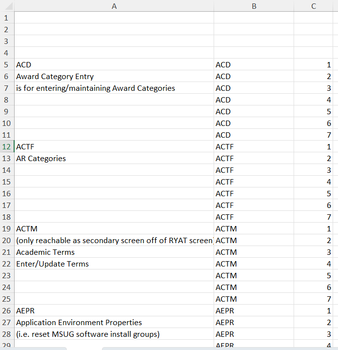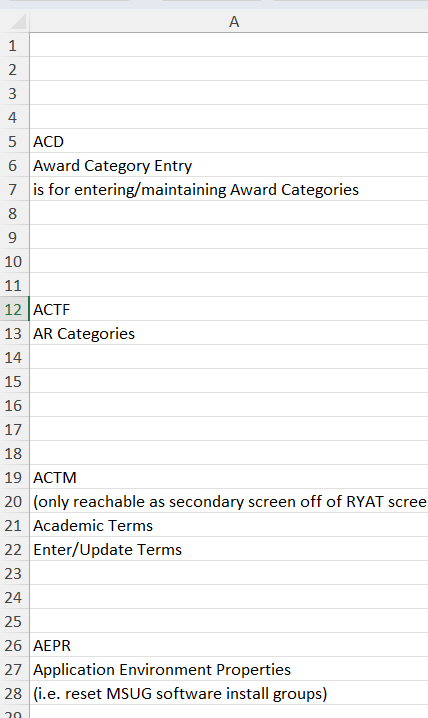 The ERP has screens (i.e. web pages) university staff and faculty use to access and maintain information in the ERP. Each web page/screen is accessed by either clicking directly on the screen's name/description on the ERP's UI menu, or by directly entering what Ellucian calls a mnemonic, which is usually just a short, unique acronym for the description of the screen.